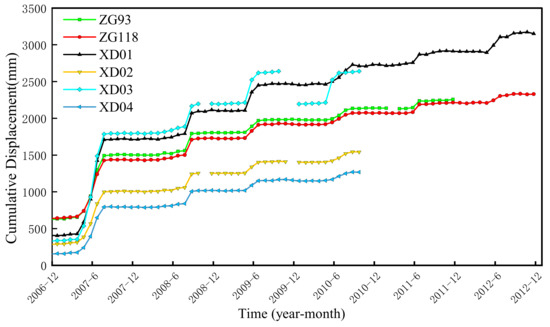 The experimental area is located in Baishuihe, Zigui County, the Three Gorges Reservoir area of the Yangtze River in China. The Baishuihe landslide is located on the south bank of the Yangtze River, with a longitude of 110°32′09″ and a latitude of 31°01′34″ (Figure 6a). The slope is located on the south bank of the Yangtze River, spreading towards the Yangtze River in a ladder shape. The elevation of the back edge of the landslide is 410 m, bounded by the rock-soil boundary, and the front edge is about 70 m. It has been submerged below the reservoir water level. The east and west sides are bounded by bedrock ridges, and the overall slope is about 30°. The length of the north-south direction is 600 m, the width of the east-west direction is 700 m, the average thickness of the sliding body is about 30 m, and the volume is 1.26×107 m3. Six Global Navigation Satellite System (GNSS) deformation monitoring points were installed on the surface of the landslide to form three longitudinal monitoring profiles (Figure 6b). The displacement was monitored once a month. Figure 7 shows the calculated displacement results from December 2006 to December 2012.
