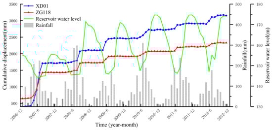 Relationship between rainfall, reservoir water level, and landslide displacement on ZG118 and XD01.