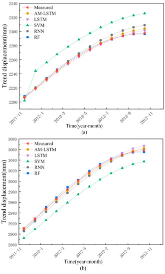 Trend displacement is driven by geological conditions. Therefore, the univariate AMLSTM NN model is used to predict the trend displacement. In order to verify the validity of the proposed model, the experiment will be benchmarked with LSTM, Random Forest(RF), RNN, and Support Vector Machine(SVM). The prediction results of the test dataset are shown in Figure 10.