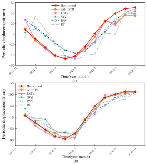 Periodic term is a key component for displacement prediction. According to the analysis in Section 4.1, the external periodic rainfall and reservoir water level both have an important influence. In this section, the periodic displacement will be predicted by the multivariate AMLSTM, and the multivariate LSTM, the SVM, the RF, and the RNN are used as benchmarks. The predictive periodic displacements by the five models are shown in Figure 11 and Table 2.
