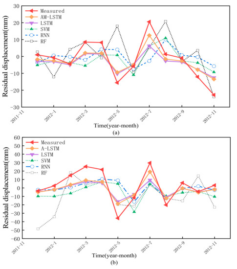 Traditionally, the residual term can be regarded as the noise, which is removed during the decomposition procedure. Throughout the test, the residual term does not belong to the white noise. Therefore, the prediction work of this term is necessary. In this experiment, the univariate AMLSTM, LSTM, SVM, RF, and RNN models are used to predict the residual displacement prediction.