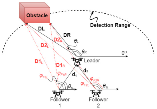 In this paper, we propose a strategy to reduce the processing power of individual agents in the swarm without losing the swarm’s ability for autonomous operation. In order to achieve this, a leader-follower based approach is adopted for maintaining the formation, due to its relatively simple implementation, scalable nature, and reliability [9,38]. The global leader in the formation utilizes a given global collision avoidance algorithm, which is then used by the followers for the calculation of the relative coordinates, which are also known as translational coordinates, w.r.t. themselves, of the detected objects in the environment, as observed by the global leader. Furthermore, followers themselves, upon receiving the observed coordinates of a detected obstacle from the leader, compute to decide the optimal time for turning on their sensors for dynamic avoidance if some error has been detected in the calculation of translational coordinates while cross-checking is performed by the leader. In the case an error has been detected, it indicates that the obstacle is not stationary anymore, i.e., the environment is not static and, hence, it is treated as a moving obstacle, i.e., the environment is dynamic.