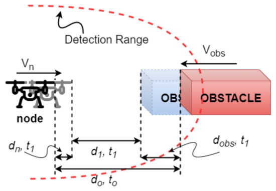 The environment is declared to be dynamic, if the leader detects one or more moving obstacles, or if the cross-check of the translational coordinates indicates a mismatch. The follower, in this case, starts calculating the obstacle’s velocity to determine the apparent point of impact. Upon estimating the point of impact, the follower node/drone itself decides when it needs to turn on its sensor(s) in order to perform active collision avoidance for safe maneuvering.
