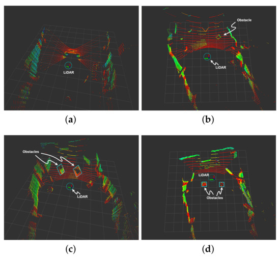 Light Detection and Ranging (LiDAR) point set snapshots at different intervals: starting point of simulation and when the obstacles are visible. (a) LiDAR data 1: at the start of the simulation. (b) LiDAR data 2: obstacles are starting to enter the detection range. (c) LiDAR data 3: obstacles are detected and in close proximity. (d) LiDAR data 4: bypassing the obstacles.