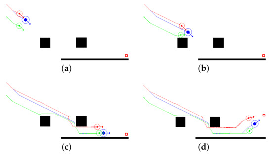 Agent 2 maintains its trajectory w.r.t. the leader without deviating from the original trajectory even while going through the obstacles and second obstacle being close to it, as can be seen from Figure 5c,d. This shows the effectiveness of utilizing the translational coordinates as the obstacle was out of the collision radius as also indicated by the performed calculations by the agent. Whereas, agent 3 maintains the pre-defined minimum distance from agent 1 after avoiding the obstacle, which is due to the third obstacle in the bottom. In Figure 5d, the destination point was moved at run-time to demonstrate the reformation process and, as can been seen, agent 3 starts going back to the position in the formation, it was supposed to be, as soon as it moves away from the obstacle in the bottom.