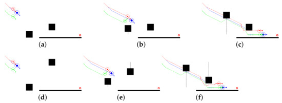 The results shown from the simulations of two case scenarios showing the traces of movement and deviations due to moving obstacles, with one moving obstacle and two moving obstacles. (a) Mission start. (b) Moving obstacle observed. (c) Overall trace of movement. (d) Mission start. (e) Movement of Obstacle 1 observed. (f) Movement obstacle 2 observed and traces of the deviated path.
