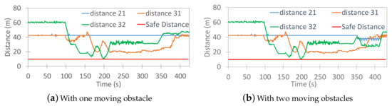 Figure 6 illustrates the simulation results for dynamic environment scenarios, where: Case 1: only one obstacle is moving, as shown in Figure 6a–c. In this case scenario, the obstacle is moving in the direction of the swarm. The obstacle, as observed by agent 1, will intercept the swarm and a potential collision is evident if agent 3 continues its trajectory, as can be seen from Figure 6b. Therefore, after performing the necessary calculations, agent 3 turns on its own ranging sensor and performs collision avoidance actively. After avoiding the obstacle, agent 3 turns off its sensors and starts following the leader once again based on translational coordinates from the leader. Figure 7a shows the distance maintained by the agents throughout the simulation; Case 2: two obstacles are moving, as shown in Figure 6d–f. In this case scenario, the first moving obstacle only disturbs agent 3, as in Case 1. However, after performing the translational coordinate calculations, as soon as agent 2 observes that the second obstacle is moving towards their direction and a collision may be inevitable, it turns on its ranging sensor to actively avoid the collision and divert from its trajectory if necessary (as shown in Figure 6f). After successful avoidance, when there are no moving obstacles in the vicinity, the agents turn off their sensors and switch back to the Follower_Function. Figure 7b shows the distance maintained by the agents throughout the simulation.
