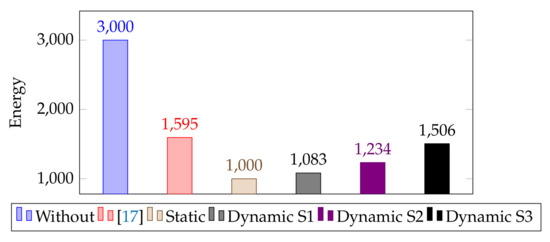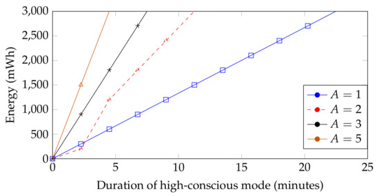 Based on the incremental consumption due to dynamic obstacles in the environment, Figure 9 shows an estimation of the relationship between the dynamicity of the environment and the energy consumption of the swarm. It is important to note that the energy consumption due to the sensor(s) usage depends on the duration that each agent stays at the high-conscious mode. It can be concluded that the energy consumption of the swarm is independent of the number of dynamic obstacles; however, it is dependent on the duration that each agent is affected by the dynamic obstacles or has to stay at high-conscious mode, i.e., their sensor(s) turned on. In the figure, represents one agent operating in high-conscious mode, represents two agents operating in the high-conscious mode, shows the consumption of the swarm when three agents are operating in the high-conscious mode, and shows the consumption of the swarm when five agents are operating in the high-conscious mode.