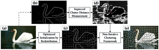 Considering that in the NIC framework, the distance measurement directly determines the feature similarity of a cluster and its neighboring pixels and the priority of label assignment. Therefore, in Figure 3f, contour pixels with greater distances tend to be assigned in the end, behind the other homogeneous elements. More generally, increases monotonically with the contour intensity in Equation (11), thus prevents the boundary pixels from being assigned prematurely and guarantees accurate convergence of all clusters. As a result, the outlines of superpixels are more consistent with the object boundary. It is also worth noting that, as a label expansion process, the framework maintains spatial connectivity of the same labels [36]. It indicates that an unlabeled pixel would neither be inspected nor assigned by a cluster if there is a set of continuous contour pixels between them, which further avoids the updating bias of cluster barycenters and misclassification of more pixels.