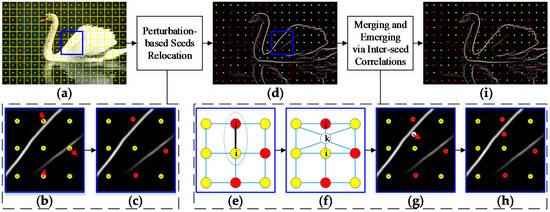 Aiming at the incipient seeds by grid sampling, firstly, a local relocation is performed on each seed within its corresponding cell . In Figure 2b,c, it is essentially a perturbation process for all seeds that dynamically adjust themselves to the lowest positions of contour intensity within a range of . Accordingly, the seeds are relocated to .