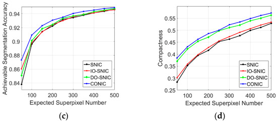 Figure 6 quantitatively evaluates the influence of two strategies on the NIC framework via several metrics mentioned above. As to IO-SNIC, it is more remarkable to further promote the effectiveness of DO-SNIC rather than simply improve the performance of SNIC. Theoretically, DO-SNIC pursues strong edge support of superpixels while maintaining the shape regularity, thus achieving desirable results in terms of UE, ASA and CO. In general, a higher compactness constraint usually leads to lower boundary adherence in DO-SNIC. To ameliorate this problem, CONIC adopts the seeds redistribution strategy to generate superpixels from non-contour seed pixels via the optimized distance measurement. As shown in Figure 5c,d, the redistributed seeds that concern varying content could pay sufficient attention to local details. In addition, it also ensures a size uniformity of superpixel generation. Consequently, it is accepted that the proposed two strategies could generate a synergetic effect that optimizes the SNIC segmentation result desirably.