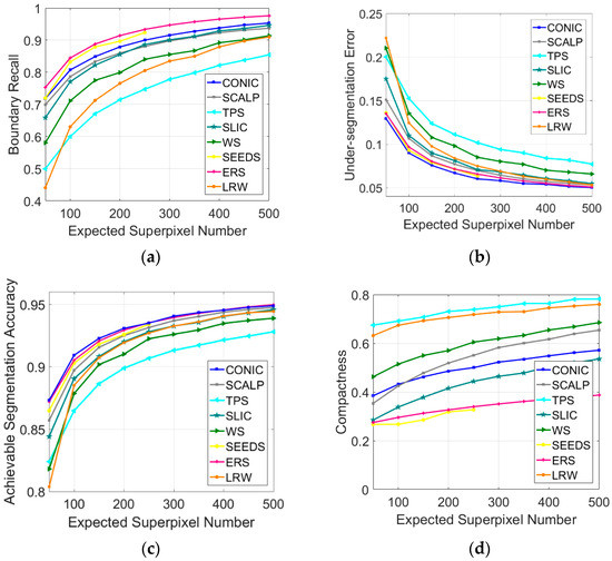 Figure 7 and Figure 8 show the qualitative and quantitative performance of eight methods on BSDS500, respectively. It can be observed from Figure 7f,g that both SEEDS and ERS generate clutter and sinuous boundaries while the superpixels catch almost all details in each image, which makes them too chaotic to analyze. On the other hand, all seed-demand methods could generate regularly shaped superpixels including LRW, which also obtains superpixels by seed generation. Generally, these algorithms initialize a set of evenly distributed seeds on a regular grid, so that the produced superpixels tend to maintain approximately uniformity in shape and size. As an elaborately tailored framework for superpixel clustering, SLIC performs a balanced trade-off between shape regularity and boundary adherence. Nevertheless, there are still sinuous boundaries around some homogeneous superpixels. SCALP introduces a new distance measurement based on contour prior, whose resultant boundaries are smoother than SLIC to some extent. TPS also adopts contour information to generate superpixels. Other than linear iterative clustering of SLIC and SCALP, it aims to find an optimal path between each neighboring seed pairs that are relocated on the object boundaries. Owing to the shortest path vertically and horizontally, the TPS superpixels are topology preserved that seems very trim. However, it performs poorly in aligning to objects. WS introduces a SLIC-like spatial constrain in the watershed framework to perform over-segmentation. As a result, superpixels are uniform in simple backgrounds and variable in objects. On the contrary, it still cannot adhere to the boundary very well since the shape constrain is too rigid.