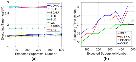 Figure 9 shows the execution time of CONIC from whole to part. Figure 9a suggests that it obtains comparable running times to the state-of-the-art methods. It also shows that CONIC, SNIC, WS and SEEDS are the fastest, which run twice as fast as SLIC on average. On the other side, SCALP, TPS and ERS are an order of magnitude slower than the first echelon. Benefited from the NIC framework, CONIC could converge efficiently with time complexity. Particularly, it avoids calculating the additional distance of pixels along the linear path in Equation (10) and therefore the computation cost is dramatically reduced. As a result, it runs over 15 times faster than SCALP with respect to a wide range of expected superpixel numbers. Specifically, in Figure 9b, the execution time of SNIC, IO-SNIC, DO-SNIC and CONIC are plotted, which explains the additional runtime spent on the NIC framework. As can be seen, compared with conventional SNIC, a little extra time is spent on deploying the proposed two strategies. Intrinsically, the additional time is almost spent on IO-SNIC that iteratively performs the seed redistribution. Even though, it still runs in near real-time and can be considered better than SNIC since it improves the segmentation quality significantly as shown in Figure 5 and Figure 6.