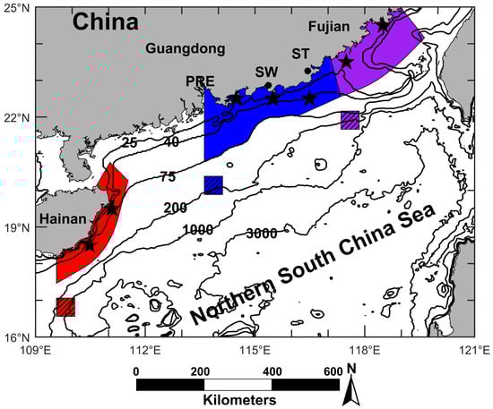 This study focuses on three known coastal upwelling regions in the NSCS (Figure 1). According to [10], the influence area of the Minnan coastal upwelling is limited to 100–150 km offshore the south coast of Fujian (purple area in Figure 1). The Yuedong coastal upwelling usually occurs to the east of Pearl River Estuary (PRE), and its influence area may extend to the area shallower than 75 m (blue area in Figure 1) [11]. The main influence area of the Qiongdong coastal upwelling is located 20–50 km offshore east and northeast of Hainan Island (red area in Figure 1) [12].