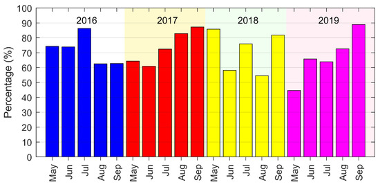 It should be noted that despite the high frequency Himawari-8 data with a 10-min temporal resolution having minimized the data gaps caused by the cloud coverage, there were still some days when the upwelling regions were completely or partially covered by cloud. Figure 2 shows the percentage of each month when the pixels were free from cloud influence. In most cases, the percentages were more than 60%. Half of the months, the percentage were more than 70%; and about one-third of the months, the percentage were more than 80%. Nevertheless, during persistent cloud cover, some significant upwelling events could not be identified in this study.