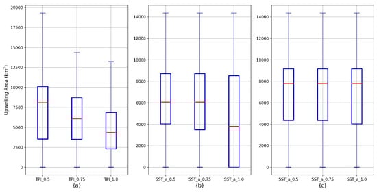 The summarized results of the sensitivity analyses of the Qiongdong coastal upwelling mapping in 2016 to the Φ and Ψ values, displayed as boxplots. (a) Ψ = 0.75 °C, Φ varies in (0.5, 0.75, 1.0), n = 92; (b) Φ = 0.75, Ψ varies in (0.5 °C, 0.75 °C, 1.0 °C), n = 92; (c) Φ = 0.75, Ψ varies in (0.5 °C, 0.75 °C, 1.0 °C), n = 60. The blue box indicates the range between the first (25th percentile) and the third (75th percentile) quantiles. The solid red line indicates the median. The two caps indicate the data range.