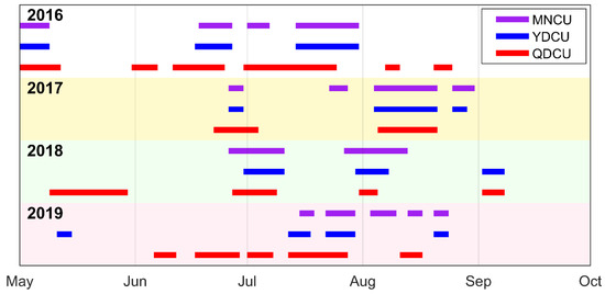 The upwelling events identified during 2016–2019 are shown in Figure 5, and the duration of upwelling is shown in Figure 6. During the boreal summers of 2016–2019, the Qiongdong coastal upwelling (QDCU) occurred most frequently, with 17 upwelling events from 2016 to 2019. The total duration of the QDCU was the longest (194 days). The mean duration of each event was about 11 days, with the longest single event lasting for 26 days (30 June 2016–25 July 2016; Figure 5). The frequency of the Yuedong coastal upwelling (YDCU) was the lowest, with only 13 upwelling events from 2016 to 2019. The total duration of the YDCU events was the shortest (120 days), averaged ≈9 days, and the longest single event lasted for 18 days (14 July 2016–31 July 2016; Figure 5). There were 15 Minnan coastal upwelling (MNCU) events during the boreal summers of 2016–2019, totaling 145 days. The mean duration of each event was about 10 days, with the longest single event lasting for 18 days (14 July 2016–31 July 2016; 4 August 2017–21 August 2017; and 27 July 2018–13 August 2018; Figure 5). The YDCU and the MNCU often occurred concurrently, which amounted to 104 days, accounting for 86.7% and 71.7% of total duration of the YDCU and the MNCU, respectively.