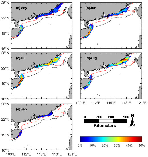 The monthly frequency of occurrence and the influence area of the coastal upwelling in the northern South China Sea (NSCS), generated by combining the daily upwelling maps in the corresponding month regardless of the year. (a) May; (b) June; (c) July; (d) August; (e) September. Red line: 40 m isobath; black line: 75 m isobath; black solid line: boundary between the Minnan coastal upwelling and the Yuedong coastal upwelling.