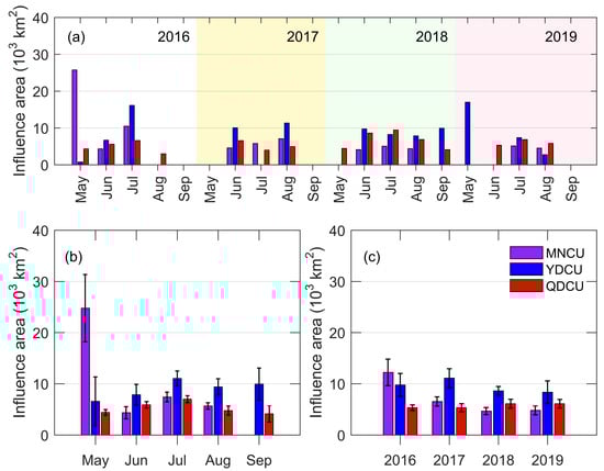As a result of the long coastline, the influence area of the YDCU was the largest in most cases among the three coastal upwelling regions (Figure 8). The influence area of the MNCU decreased from 2016 to 2019, being ≈1.3 × 104 km2 in 2016 while ≈4.8 × 103 km2 in 2019 (Figure 8c). The influence area of the YDCU increased from 2016 (≈9.5 × 103 km2), reached the maximum in 2017 (≈1.1 × 104 km2), and then decreased to a minimum in 2019 (≈8.3 × 103 km2). The influence area of the QDCU did not vary much from 2016 to 2019, ranging from ≈5.3 × 103 km2 in 2016 and 2017 and ≈6.1 × 103 km2 in 2018 and 2019 (Figure 8c).