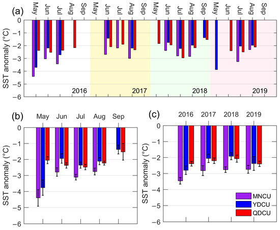 During the boreal summers of 2016–2019, the inter-monthly pattern of SST_A was similar to that of the upwelling’s influence area. Except for the MNCU and the YDCU events that occurred in May 2016, the coastal upwelling intensified from May, peaked in July, and then weakened to its minimum in September (Figure 9b). The SST_A differences among these months are generally statistically significant. In terms of the inter-annual variation (Figure 9c), the MNCU’s mean SST_A was ≈−3.6 °C in 2016 and reduced to ≈−2.8 °C during 2017–2019. The SST_A differences between 2016 and the next years are statistically significant (Figure 9c). The YDCU was the strongest in 2016 (≈−2.8 °C), but it was the weakest in 2018 (≈−1.9 °C). The SST_A differences between 2016 and 2017 (between 2016 and 2018) are statistically significant. The QDCU was strong in both 2016 and 2019 (≈−2.4 °C) but weakened from 2016 to 2018 (≈−2.1 °C).