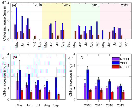 The inter-monthly and the inter-annual variations of the coastal upwelling’s Chl-a increase (unit: mg m−3) in the NSCS from 2016 to 2019. (a) The monthly mean of upwelling’s Chl-a increase for the individual years 2016, 2017, 2018, and 2019; (b) the monthly mean of the upwelling’s Chl-a increase regardless of the year; (c) the annual mean of the upwelling’s Chl-a increase. The error bars in (b,c) are 95% confidence intervals.