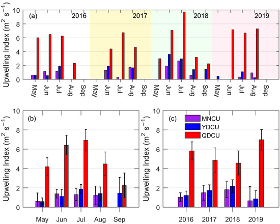 The inter-monthly and inter-annual variations of the upwelling index (m2 s−1) in the NSCS from 2016 to 2019. (a) The monthly mean of upwelling index for the individual years 2016, 2017, 2018, and 2019; (b) the monthly mean of the upwelling index regardless of the year; (c) the annual mean of the upwelling index. The error bars in (b,c) are 95% confidence intervals.