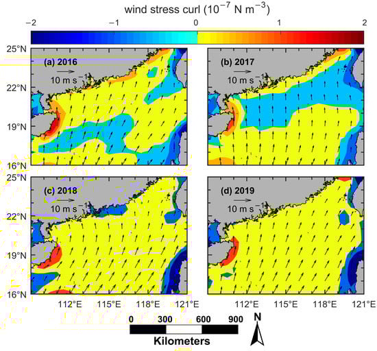 Since May and September are the monsoon transition seasons, Figure 12 only shows the mean wind field and wind stress curl from June to August each year. The wind stress curl off the east coast of Hainan Island was much larger than that off the east coast of Guangdong or off south coast of Fujian from 2016 to 2019. That is to say, during 2016–2019, the wind stress curl was also an important cause of Qiongdong coastal upwelling. As for the Yuedong coastal upwelling and the Minnan coastal upwelling, the wind stress curl was ≈0 or negative in most cases, which means that the wind stress curl did not induce upwelling or even induced downwelling during 2016–2019.