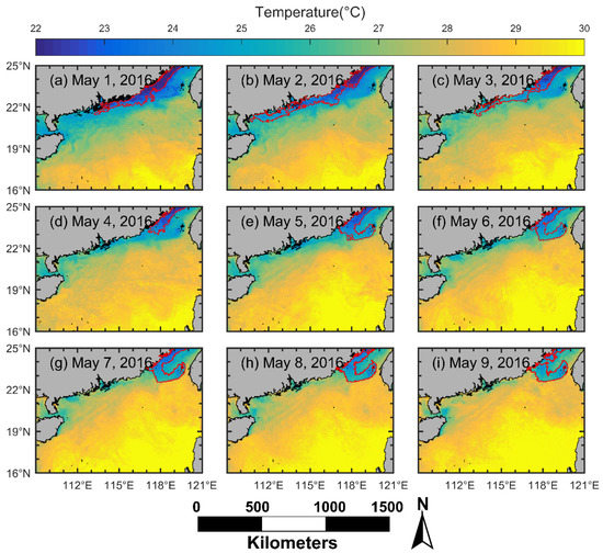 SST in the NSCS from 1 May to 9 May 2016. (a–i) represent the SST on 1 May to 9 May 2016, respectively. The areas within the red line are the low-temperature areas mapped by the TPI method (also the upwelling candidate).