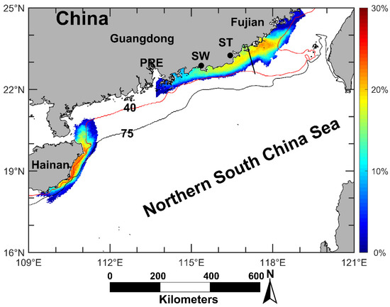 The frequency of occurrence and influence area of significant coastal upwelling in the NSCS. The color represents the frequency of upwelling occurrence. Red line: 40 m isobath, black line: 75 m isobaths, black solid line: border between Minnan coastal upwelling and Yuedong coastal upwelling. (PRE: Pearl River Estuary, ST: Shantou, SW: Shanwei).