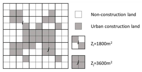 Thinh et al. proposed a quantitative measurement model (T model) to calculate urban compactness [33]. On the basis of GIS and urban land-use data, the T model overlays the grid cell of a certain size of urban land-use data to generate the basic data layer for model operation. As an example, Figure 2 shows the urban land-use data obtained from Landsat remote-sensing images, and the pixel size of the image is 30 m × 30 m. The grid cell size is 60 m × 60 m, which depends on the scale of the study region area of the urban construction land [34]. The T model can measure the 2D spatial gravity between different parts of urban construction land. The T model is expressed as follows: