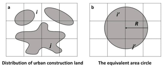 To offset the influence of the study area factor on the T model, the Normalized 2D Compactness Index (NCI) is presented as an improvement [34]. The Normalized 2D Compactness Index is defined as the ratio of the actual urban construction land to the equivalent circular land (Figure 3) [48]. It not only integrates various features of irregular urban form but also standardizes the calculation results, to compare compactness of different cities. Song et al. used NCI to research the relationships between urban commuting and urban form. The NCI model is expressed as follows [35]: