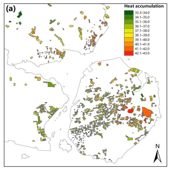 In detail, the LST of typical Xiamen communities in spring ranges from 28.1 °C to 35.4 °C, with a mean temperature of 33.1 °C, a minimum LST of 38.5 °C, and a maximum of 44.4 °C in summer. The LST of autumn was reduced from 40.8 °C to 35.4 °C; however, the LST at the time of winter was relatively lower than that in other seasons, which ranges from 15.7 °C to 19.7 °C, with the mean temperature of 17.4 °C (Figure 9b). To that extent, the four images (Figure 9b) can typically represent the LST conditions in different seasons in Xiamen. Figure 9a shows that the total heat accumulation in the whole year ranged from 33.3 °C to 43.0 °C. The biggest heat accumulation during the period 2017–2018 was primarily located in the high-density areas of Xiamen, such as the central and eastern Huli district and the southern Jimei district. From the above, we could infer that the heat accumulation has a close relation to the urban morphology of the study area.