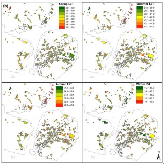 Spatial distribution of the heat accumulation in each community of the study area, (a). Spatial distribution of the LST across four seasons in each community of the study area, (b).