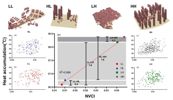 The correlation between the average NVCI of four urban morphology types and heat accumulation was significant at a level of 0.01, with R2 value being 0.996. Figure 11e shows that, for low-rise communities, the heat accumulation increased by 1.6 °C when building density changed from low (27.1%) to high (46.1%), while, for high-rise communities, the heat accumulation also increased by 1.6 °C when building density changed from 22.1% to 39.4%. Similarly, the heat accumulation increased by 0.2 °C with increasing building height levels in the low-density communities while, in the high-density communities, the heat accumulation also increased by 0.2 °C when building height shifted from low (5 floors) to high (10 floors) (Table 7). We concluded that an increase in building density will lead to greater heat accumulation than that from building height. The results indicated that, compared with building height, building density was a major factor affecting the UHE.