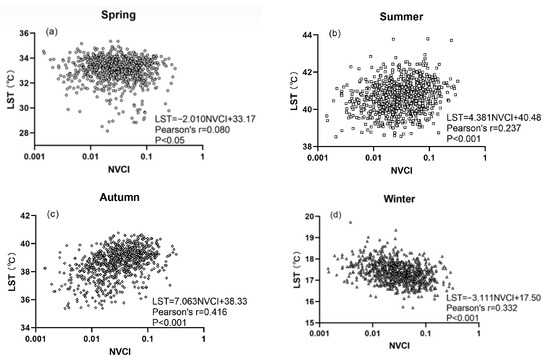 Relationships between NVCI and LST in (a) spring; (b) summer; (c) autumn; (d) winter.