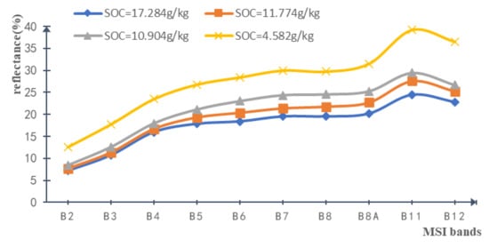 An inspection of Figure 1 shows the dominant land coverage to be arable land with scattered areas occupied by buildings and water bodies. To accurately acquire the bare soil pixels in the S2A data, the water bodies and buildings were identified and masked. After the arable land pixels with NDVI values greater than 0.2 were masked, the rest of the arable land was identified as bare land, accounting for about 26% of the study area. Additionally, even though the S2A spectral reflectance is the result of many soil factor especially soil moisture and soil texture, SOC has a significant negative correlation with spectral reflectance, i.e., a lower SOC concentration corresponds to bare soil pixels with high reflectance and a higher SOC concentration corresponds to bare soil pixels with low reflectance (Figure 3). These curves corresponded to maximum and minimum, as well as to two random values of measured SOC between the maximum and minimum values.
