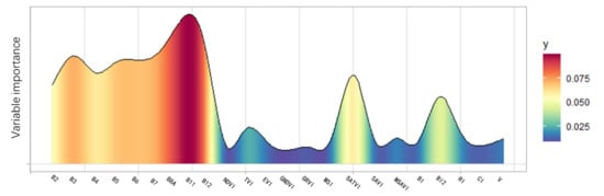 The spectral reflectance remote sensing data provide a comprehensive identification of various ground objects including vegetation, water, and soil [43,44]. The characteristics of S2A spectral reflectance for bare soils significantly reflected several soil physical and chemical properties, such as soil water, texture, iron, organic carbon, CaCO3, and salinity. The spectral signature of certain soil properties is characterized by the signature’s general shape, reflectance intensity, and specific absorption bands. For soil properties, SOC concentration is a synthetic reflectance of soil conditions such as plant growth, water, and soil color. Therefore, in addition to the selected nine S2A spectral bands, several spectral indices were integrated into the retrieving models that included vegetation indices (that are sensitive to biomass, that is, sensitive to organic carbon), water indices (that are sensitive to soil moisture), and brightness-related indices (that are sensitive to both organic carbon content and soil texture) [24]. The selected specific spectral indices included NDVI [45], Transformed Vegetation Index (TVI) [46], Enhanced Vegetation Index (EVI) [47], Green Normalized Difference Vegetation Index (GNDVI) [48], Green-Red Vegetation Index (GRVI) [49], Moisture Stress Index (MSI) [50], Soil-Adjusted Vegetation Index (SAVI) [51], Soil-Adjusted Total Vegetation Index (SATVI) [52], the Second Modified Soil Adjusted Vegetation Index (MSAVI2) [53], Brightness Index (BI) [54], the Second Brightness Index (BI2) [54], Redness Index (RI) [55], Color Index (CI) [56], and vegetation (V) [56]. The specific calculation formulae are shown in Table 3. Six of the 14 spectral bands were selected as the indices for SOC retrieving (shown in bold in Table 3), filtered by the weighted average of variable importance in each retrieval model (Figure 4) and environment in study area. The threshold we chose for their exclusion was 0.023, in which the nine bands mentioned above as well as SATVI, BI2, and TVI were chosen. Nevertheless, to avoid a small amount of vegetation cover on the soil, several vegetation indices sensitive to low vegetation cover and soil were selected, including NDVI, SAVI, and EVI.