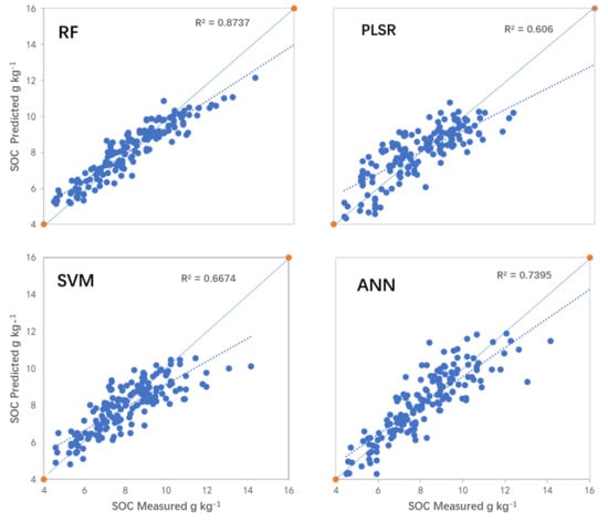 Selecting the correct prediction model was an essential factor determining soil attributes prediction accuracy from multispectral images. Based on the spectral reflectance values extracted from the same satellite image and the same sample dataset, the current research compared the ability of training soil surface SOC and predicting SOC by RF, PLS, SVM, and ANN regression algorithms. Even though Castaldi et al. [25] indicated that the performance of the RF model was not optimal and that the correlation between variables was weak, the RF algorithm was still used to bond reflectance and SOC, and a predictive model with high consistency was, indeed, obtained (Table 5 and Figure 5). Even though PLSR is the most commonly used multivariate statistical technology in soil science [65,66,67,68], it was not satisfactory in this study. This may be because PLSR is a linear model, but the relationship between organic carbon and the soil spectrum may be nonlinear, especially for the region with strong variability and large range. While RF is a nonlinear model, it performed regression tasks by multiple decision regression trees, and retrieved the surface organic carbon content value by weighted average of regression results according to variable importance (Figure 6). Meanwhile, RF makes comprehensive and in-depth data mining analysis on independent variables both in regression and classification [69,70,71]. Therefore, RF had more advantages than PLSR in this study. In addition, model performance is not only related to the algorithm itself. The tendency of variable importance in the ANN model was significantly different from the other models. This may be because ANN is an unsupervised algorithm. Farifteh et al. [35] reported that both methods have a great potential for retrieving and mapping soil salinity, but PLSR performed better, after comparing PLSR and ANN in quantitative analysis of salt affected soil reflectance spectra, because the relation between soil salinity and soil reflectance can be approximated as a linear correlation. Although the importance of variables in the SWIR was high for all of the models, there were obvious differences in the importance distribution of other variables. It was also shown that, in line with previously reported results, S2A has outstanding inversion ability for soil properties [23], and may be higher than the Landsat series, the SPOT series, and other land resource satellites. Therefore, S2A is expected to be applied at a large scale in the future.