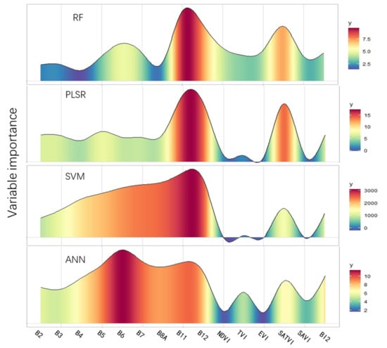 The selected variables importance in models is shown in Figure 6. The figure shows that the variable with the highest relative importance in all models (except ANN) was B11, corresponding to the wavelength band of 1565–1655 nm, followed by B12 (1610 nm). This result is consistent with the higher reflectance of graded SOC content in the SWIR spectral ranges (Figure 2). It is significant that the variable importance of the RF and PLSR models had similar variation tendency, and the variables in SWIR have higher weight. These variables included B11, B12, and SATVI, while BI2 in the PLSR model was important as well. However, for the other two models, the variable importance in the visible wavebands was higher, especially in the ANN model. B6 had the highest weight in the ANN model, but the importance of variables in the SWIR should not be ignored.