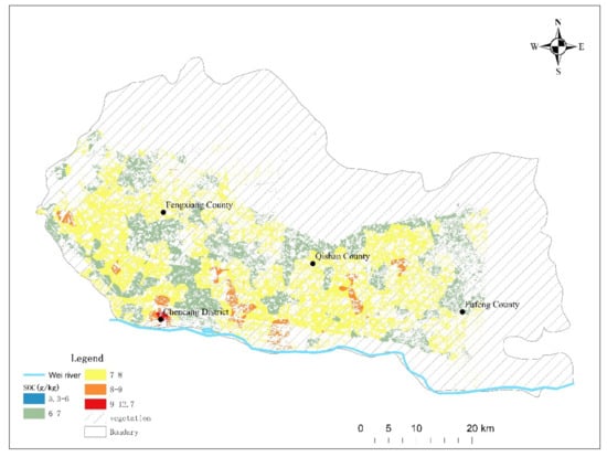 In order to better express the geographical differences of the SOC content, the interpolation results were manually divided into five classes and shown on a map of the Guanzhong Plain study area (Figure 8) in which the spatial dependence of SOC is shown. In the lower terrace of the Wei River, the SOC content was generally higher, and about 60% of the fifth class of SOC (9–12.7 g/kg) was found here. The SOC content of the higher terrace and Loess Plateau far away from the Wei River was relatively low. From the perspective of administrative divisions, the soil of the Chencang district has relatively high SOC content, followed by Qishan county because of proximity to the Wei River. Moreover, SOC content over the study area ranged from 5.39 g/kg to 12.7 g/kg, with an average value of 7.23 g/kg. The interpolation result was still a left-skewed distribution, with more than two-thirds of the area belonging to 5–8 g/kg class.