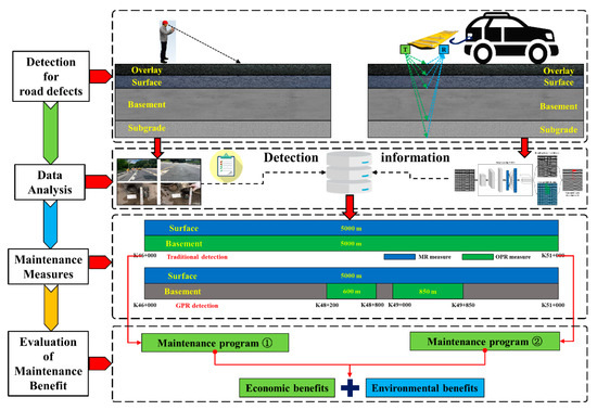 On the other hand, researchers have performed many studies of the standardization of road testing and maintenance [33,34]. The group criteria of technical guidelines for ground-penetrating radar detection of the internal condition of highway asphalt pavement has been published by the China Highway and Transportation Society (CHTS) [35], which has provided a scientific reference for future exploration. However, these attempts are far from numerous. Therefore, in the present study, we developed a method for evaluating the maintenance benefits by comparing the traditional detection and GPR detection in asphalt pavement.