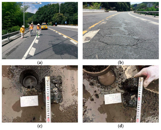 As shown in Figure 3, visual surveying and measurement were adopted by testing personnel to determine the damage condition of the pavement, and an inspection van was used to survey the surface roughness and skidding resistance of the pavement. Moreover, a coring survey was taken to obtain an accurate thickness of the asphalt pavement according to the highway performance assessment standards (JTG 5210-2018) and the specifications for maintenance design of highway asphalt pavement (JTG 5421-2019), which was enacted by the Ministry of Transport of the People’s Republic of China.