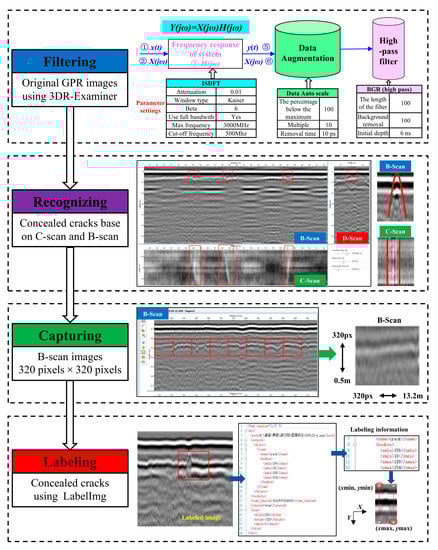 The construction of a deep, learning-based road internal defect identification model requires a 3D GPR image dataset to provide the training set, verification, and testing required for model construction. This process was conducted by taking the steps in Figure 6.