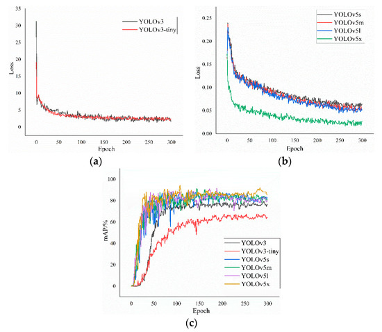 As is shown in Figure 8, the loss and mAP curves of the YOLO models were compared. The value of loss represents the difference between the predicted value and true value. The smaller the value of loss, the better training effect. Moreover, the high mAP also denotes a great performance of the training models.