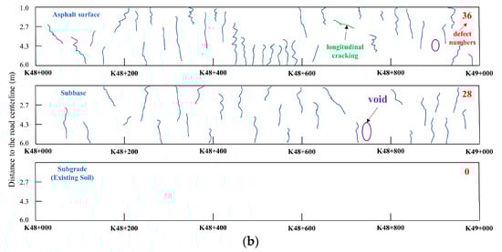 The main defect types of the tested road section are cracking (more than 90%), void zones, and raveling. Therefore, the characteristics of the cracking were the focus of the analysis. First, the overall cracking density of the proposed maintenance roads was low. Specifically, the cracking density of the surface was 1.5 m/m2, the cracking density of the basement was 1.0 m/m2, and the number of void defects was 9 (the total area was 27 m2) in the left side of the tested road. Moreover, the cracking density of the surface was 0.8 m/m2, the cracking density of the basement was 0.6 m/m2, and the number of void defects was 13 (the total area was 52 m2) in the right side of the tested road.
