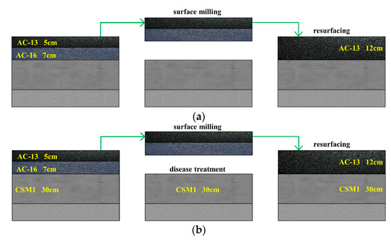 First, for the general road sections with low defect severity, the milling measure for the original surface (5 cm AC-13 and 7 cm AC-16) should be performed. Then, the new surface (12 cm AC-13, a previous study demonstrated that the maintenance measure of AC-13 has the highest comprehensive benefit [41]) is spread on the basement (milling and resurfacing, MR). In terms of the road sections with severe defects, after the surface milling measure, the treatment of defects (overlay paving for reinforcement, OPR) is conducted on the basement before the resurfacing.