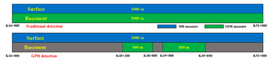 Finally, according to the analysis for defect characteristics and maintenance measures based on conventional detection and GPR detection, the maintenance programs were established for these two detection methods. As presented in Figure 12, the MR measure was conducted for surface maintenance based on both detection methods. However, this was not the same case for the basement. Specifically, the OPR measure was adopted for the full range of basement with conventional detection, while only 1450 m for the basement of serious diseases with GPR detection.