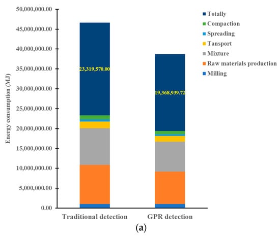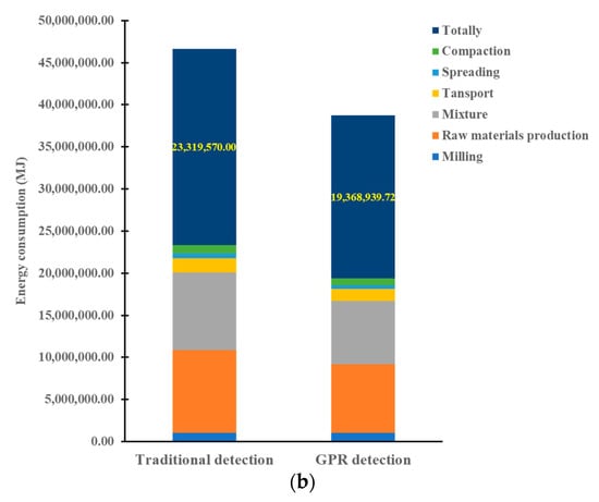 The contrast between the energy consumption and carbon emissions of the two detecting methods is shown in Figure 14. Obviously, the energy consumption and carbon emissions based on GPR detection were less than those based on traditional detection and were reduced by 792,106 MJ/km (16.94%) and 56,289 kg/km (16.91%), respectively.