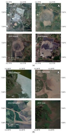 (a) Series of images of LUSI mud volcano eruption that show the expansion of the inundated area due to the mud volcanic eruption and the ring dyke to contain the mud and (b) Porong Delta development after diversion operation which shows rapid delta and mangrove belt expansion. Source: Google Earth Pro.