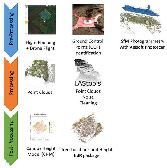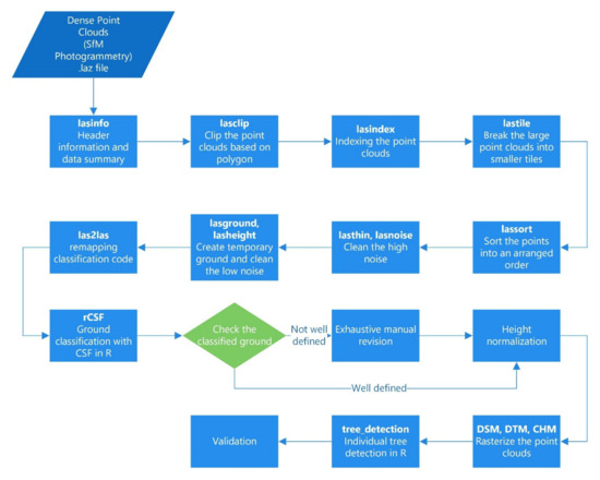 The processing phase consists of nine steps, which are quality checking, clipping, indexing, tiling, sorting, noise removal, ground classification, height normalisation, and generating the Canopy Height Model (CHM). Details in this phase are described in Figure 4. We used LASTools (rapidlasso GmbH, Gilching, Germany) to clean the artefacts. The Cloth Simulation Filter (CSF) algorithm [46], which is efficient to extract the bare earth in lidR package [47], was employed for ground classification. As the first step, we assess the quality and information, e.g., number of points, projection, and point density with lasinfo module. Dense point clouds derived from SfM photogrammetry still contain noise and uncertainties [48,49]. Therefore, to get an optimal application in the mangroves environment, a cleaning procedure should be considered. The waterbody is the main noise contributor of the SfM photogrammetry point clouds. We visually inspected the orthomosaic and draw a polygon which excludes water and selected the area of interest. The raw point clouds were then clipped based on the polygon with lasclip module. Next, we tiled and indexed the clipped point clouds into a smaller tile of 40 × 40 m and added a buffer that was 20% of the tile size. The tiling procedure is useful to decrease the computational time by taking advantage of parallel computation. Another consideration is that, the free licensed LASTools has a point limitation about 1~15 million points [50]. Therefore, tiles should be adjusted with the allowable number of points as attached to the license. The tiled points were then sorted to rearrange the points into a space-filling curve order. Afterward, we reclassified the highest points, find the highly isolated points in the dense forest, to create a temporary ground classification. Next, we mapped all the points located 0.2 m below the temporary ground as noise. These high and low noise were removed with the lasthin and lasnoise module. The cleaned photogrammetry point clouds then were processed with the CSF algorithm in the lidR package to define the ground points. An exhaustive manual revision of the ground-no ground classification was done in the dense forest to avoid ground misclassification. The point clouds were created only from what is visible to the camera within the path not penetrating the canopies, because of that only vegetation tops/canopies were included. Therefore, careful manual revision had to be made. Finally, points were height-normalised by replacing the height of each point to the relative height of the ground-classified points. Subsequently, we converted the height-normalised points into CHM and the ground-classified points into DTM.